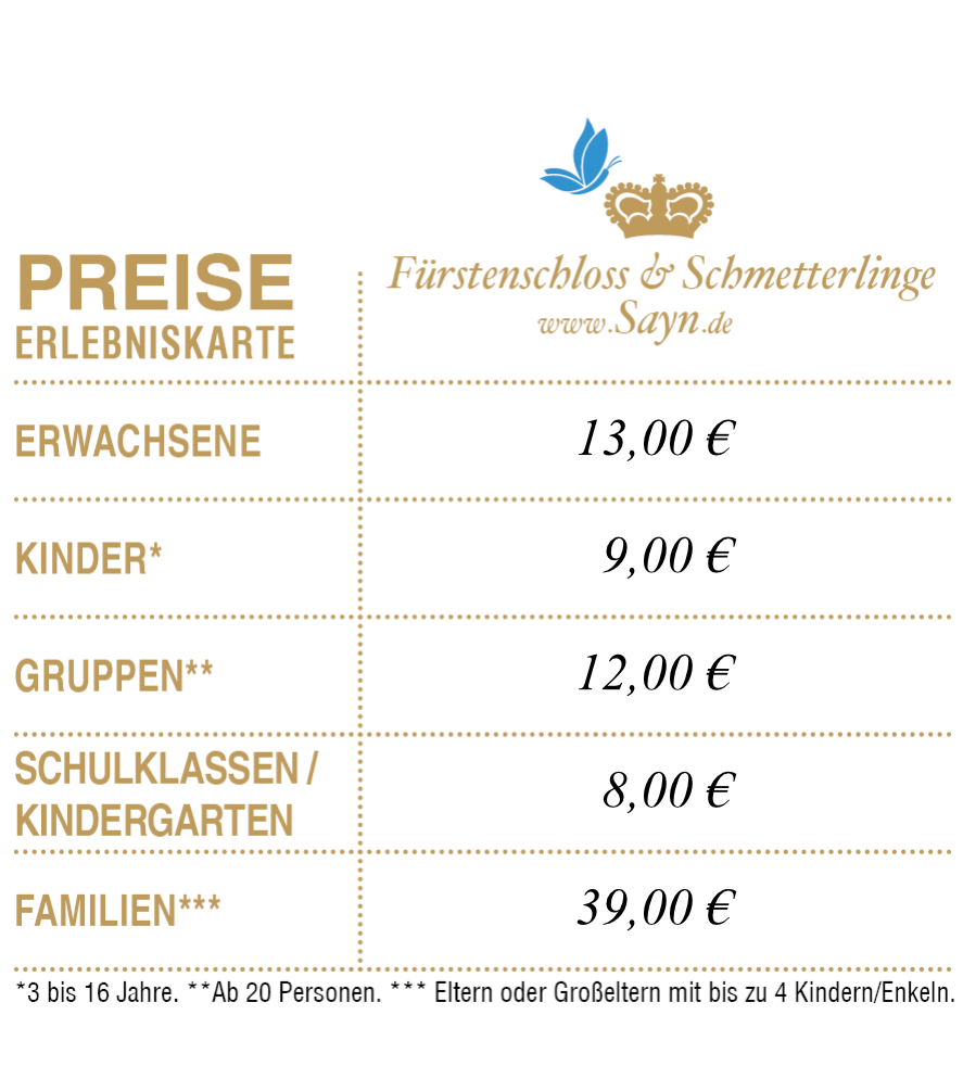 Mit Ihrer Erlebniskarte können Sie den Garten der Schmetterlinge und das Neue Museum Schloss Sayn auch an unterschiedlichen Tagen innerhalb einer Saison besuchen.