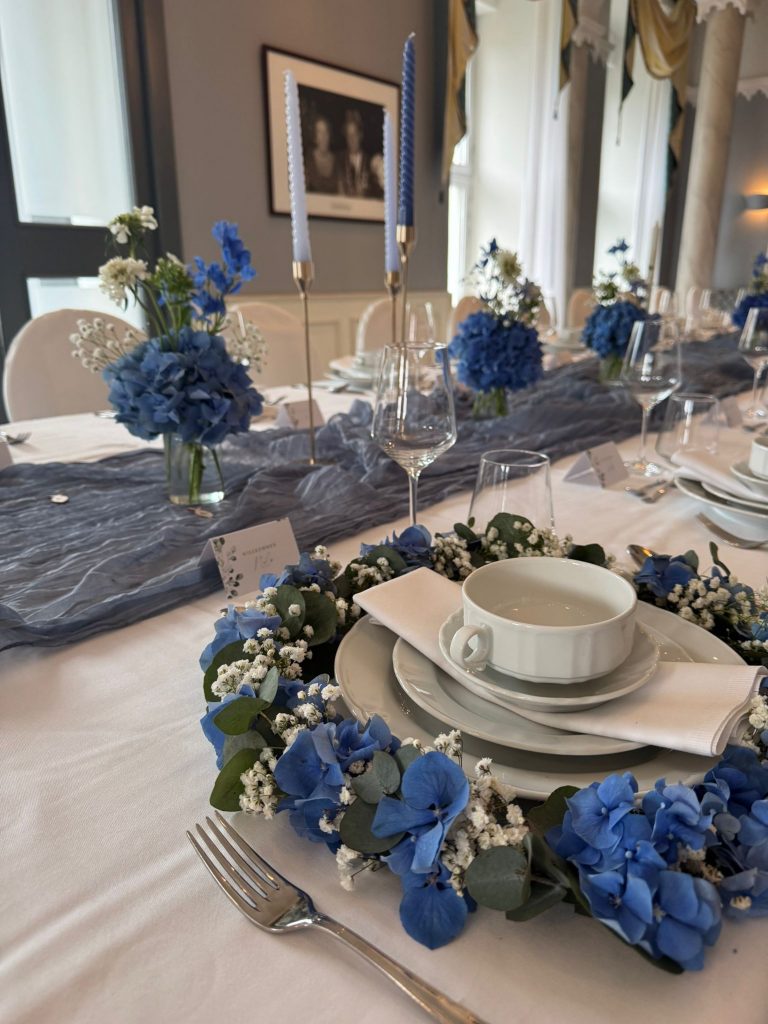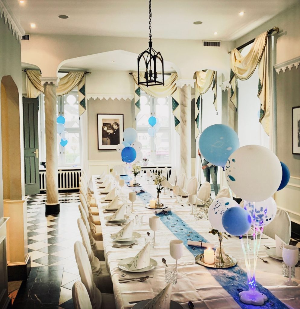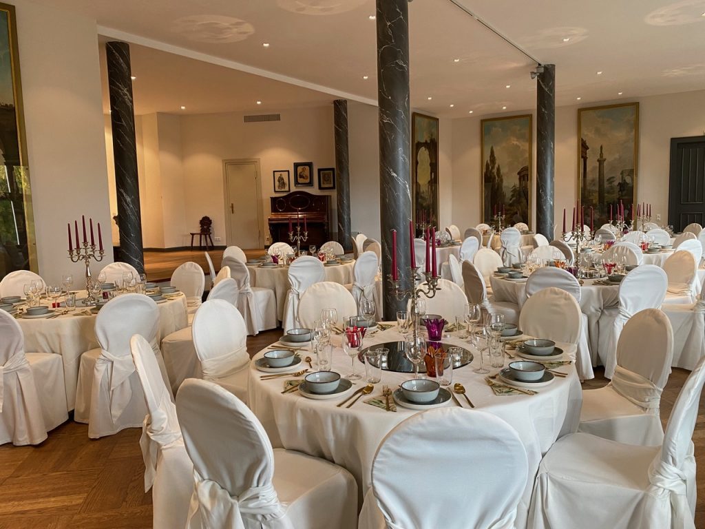 Für elegante Empfänge und festliche Feiern – wie Hochzeiten, Jubiläen oder Geburtstagsfeste – bietet sich der prachtvolle Festsaal an, der mit einem bezaubernden Gartensalon sowie einer großzügigen Freiterrasse verbunden ist. Der Festsaal mit Bühne bietet Platz für bis zu 80 Gäste, während der Gartensalon eine stilvolle und zugleich gemütliche Atmosphäre für bis zu 35 Gäste schafft.